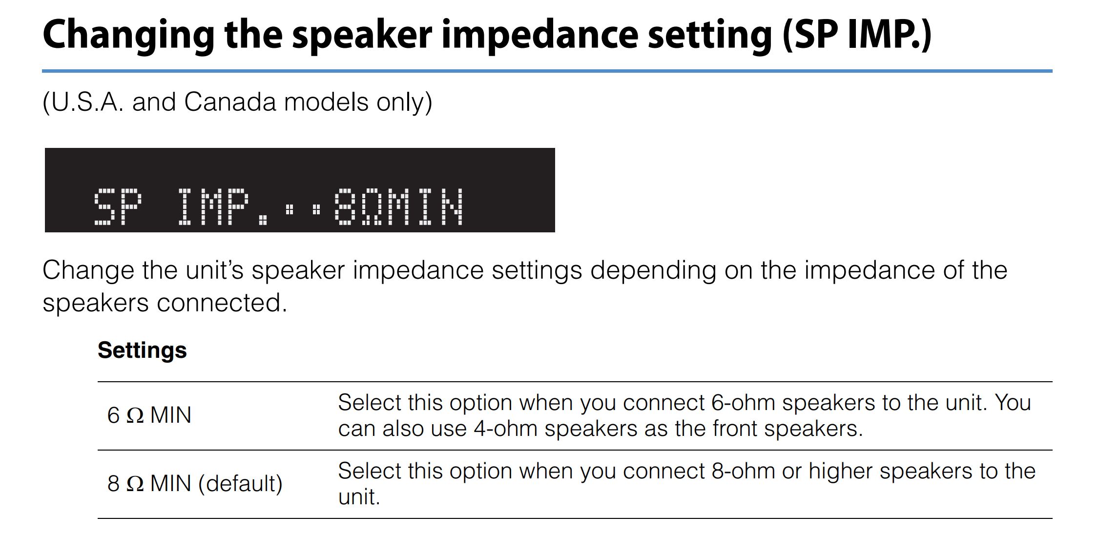 연결할 때 6옴 스피커의 경우 스피커 임피던스를 6옴 MIN"으로 설정한다.