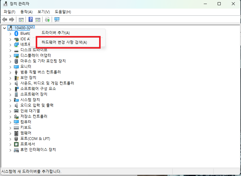 장치관리자에서 하드웨어 변경사항 검색을 하면 바로 인식한다.