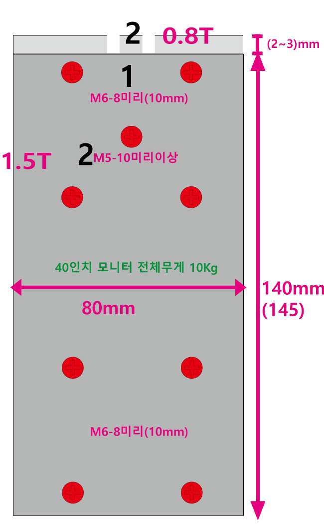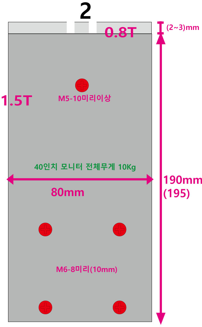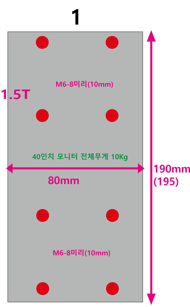 2. 40인치 모니터 사용을 위한 중간 아답타 적용 (필립스 4065UC)-----------------*어댑터의 크기는 모니터의 크기 모니터 베사홀의 위치에 따라 달라질 수 있음*구형제품에서는 M6 8mm 나사와 너트를 사용해서 끼워줘야 하고 장착도 조금 힘들었는데..( 4개 세트)신형제품은 M6 8mm(10mm) 나사를 쉽게 그대로 조여 주면 된다. ( M6 8mm(10mm) 8개 너트 4개 )중간 아답타만 붙이고 나사로 조여주면 끝이다.아래 4개는 그대로 조여주고 위 4개는 너트를 이용해 조여준다.매우 간단하다.구형제품보다 중간 아답타 만들기가 편하다.