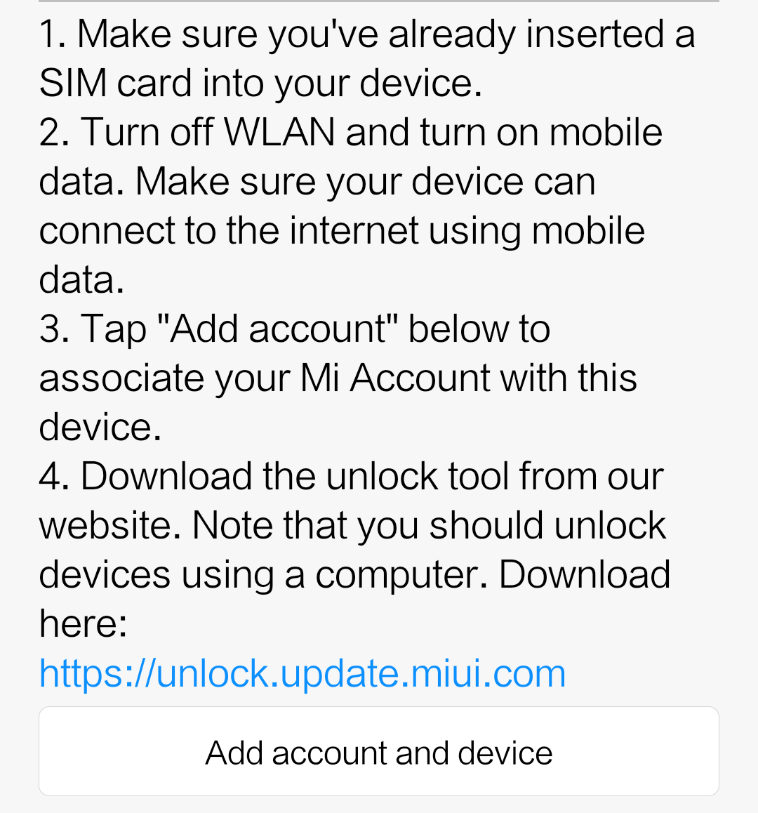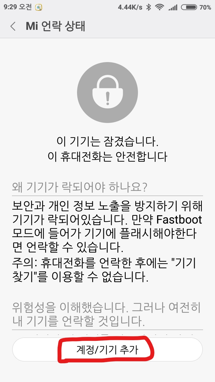 → Mi언락상태(Mi Unlock status) → 계정 추가하기(Add account and device)