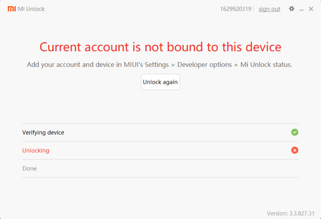 컴퓨터가 샤오미 언락을 지원하지않는다는 의미이다.