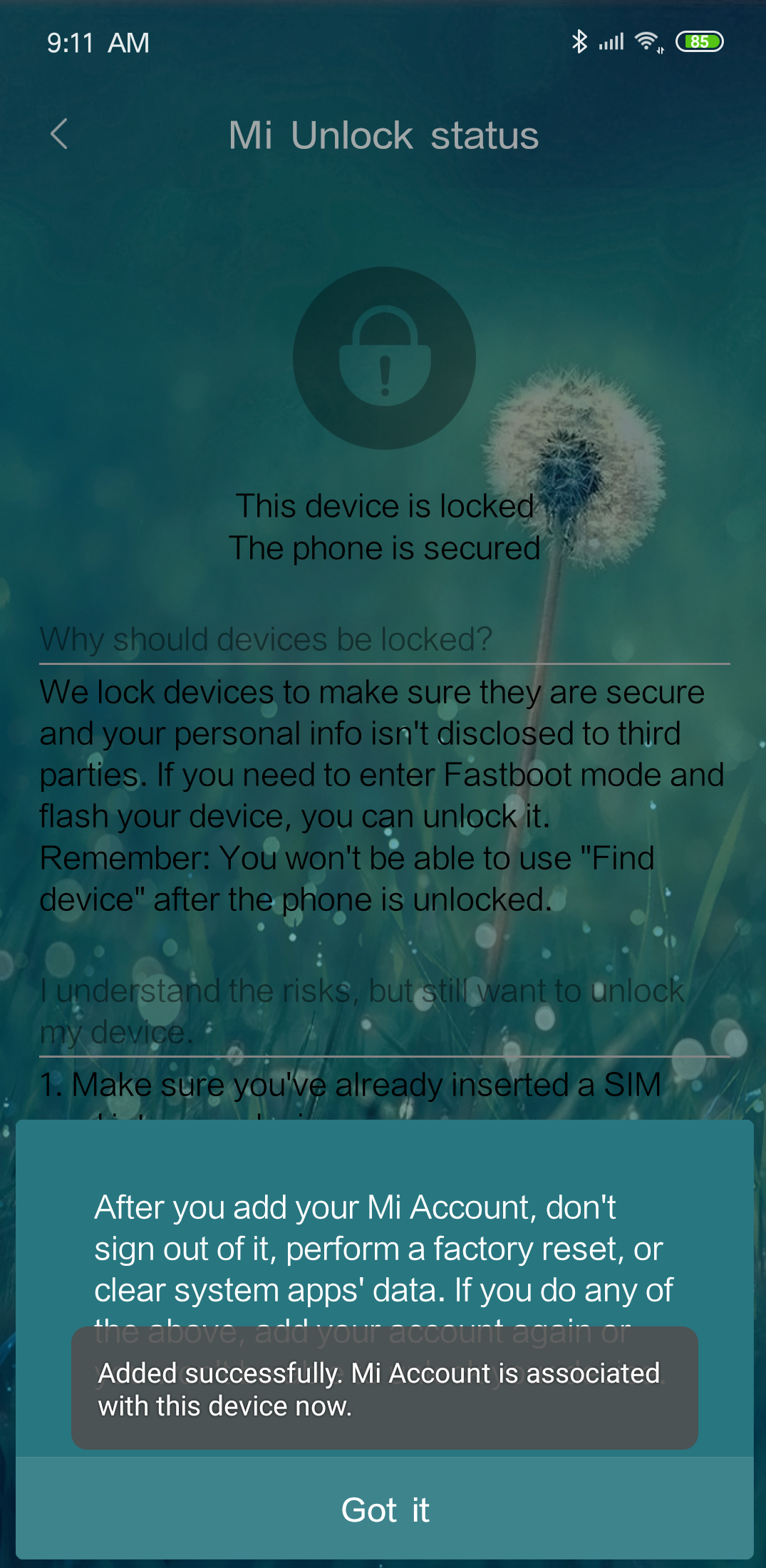 샤오미에서 사용자가 임의로 롬변경을 할수 없도록 부트로더에 락을 걸어 놓았다.