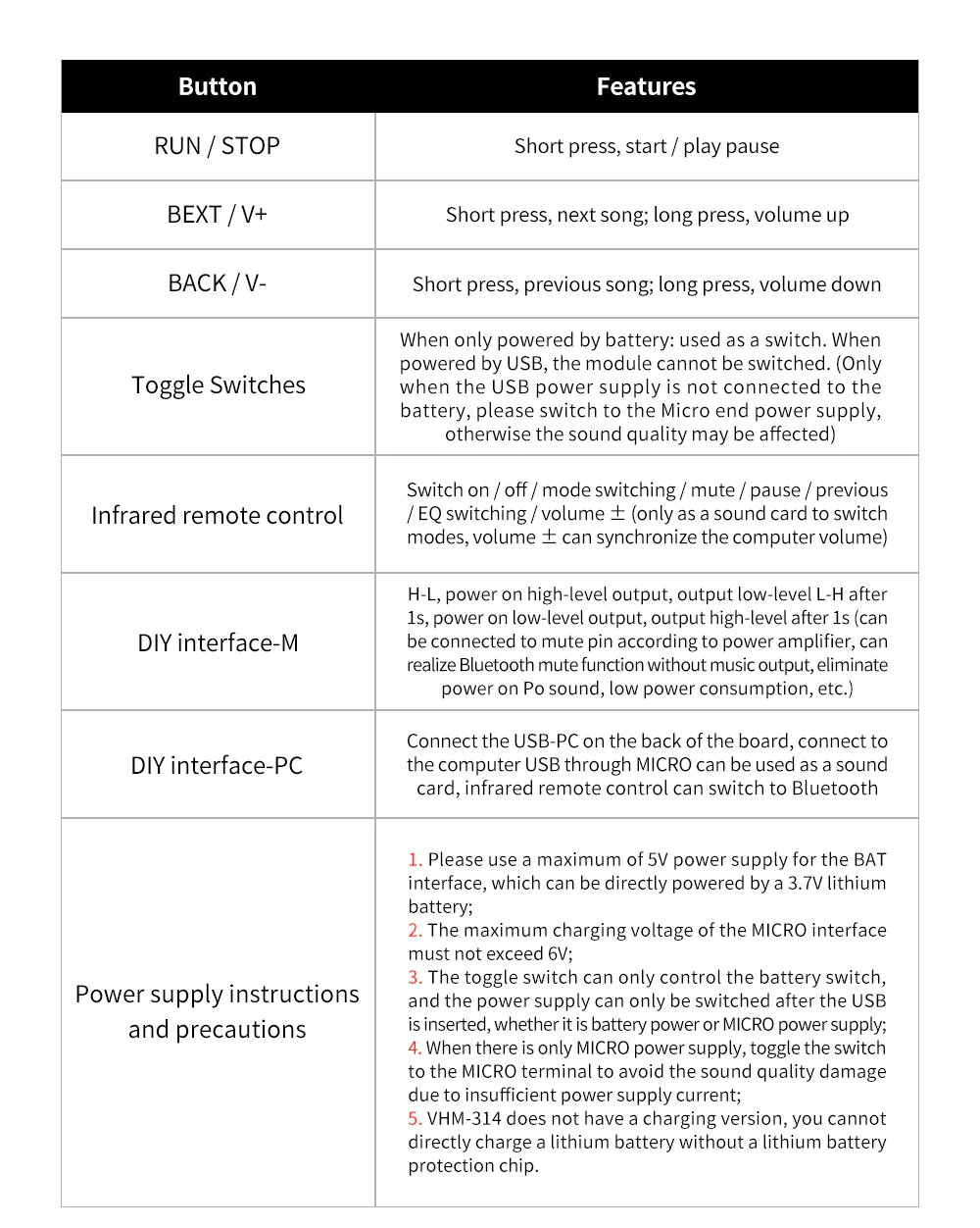 VHM-314에는 충전 버전이 없으므로 리튬 배터리 보호 칩이 없으면 리튬 배터리를 직접 충전 할 수 없습니다.