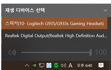 G933S의 USB 리시버를 장착하고 헤드셋이 아닌 스피커로 전환하기 위해서는 작업 표시줄의