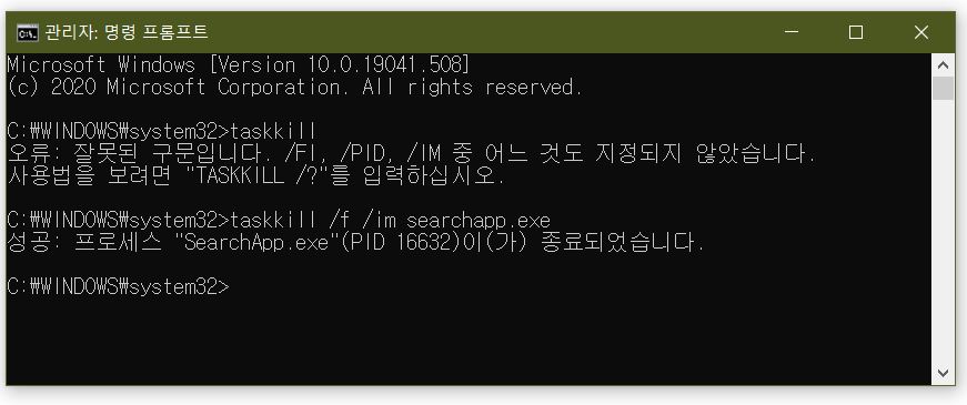 - C : \ WINDOWS \ System32> taskkill /f /im SearchUI.exe