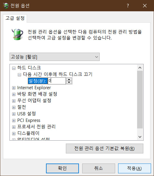 하드디스크 끄기를 0분으로 설정한다.