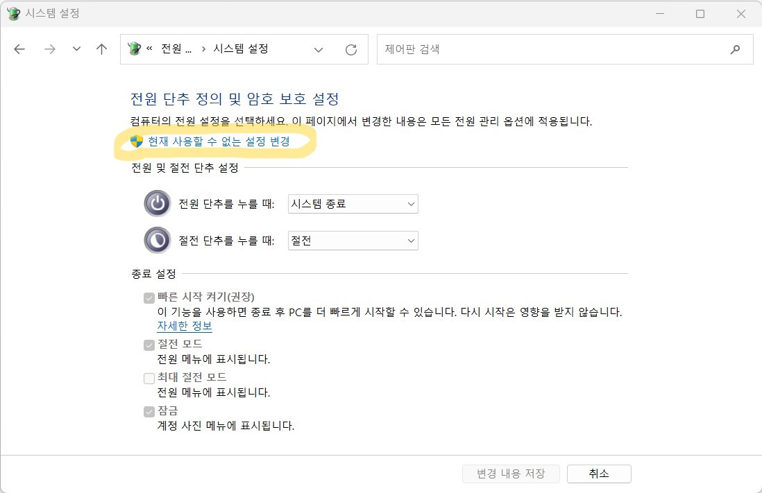현재 사용할수 없는 설정 변경 클릭한다.