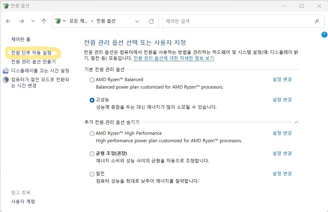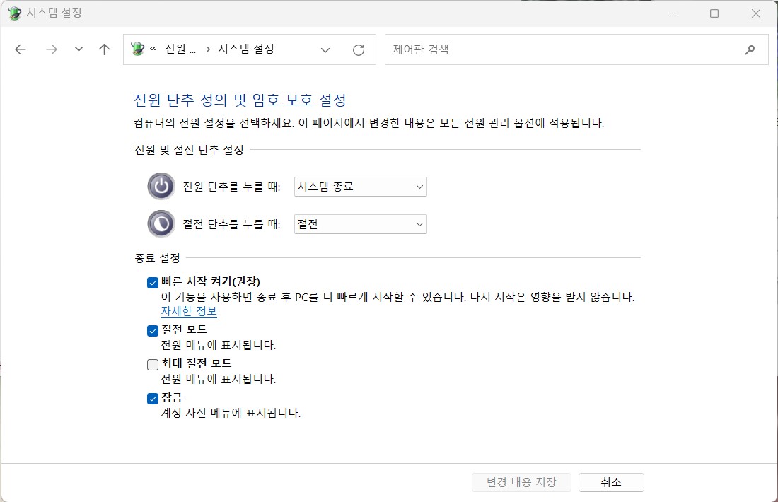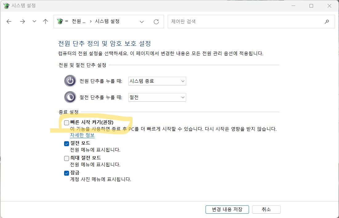 빠른 시작 켜기가 활성화가 안된다.