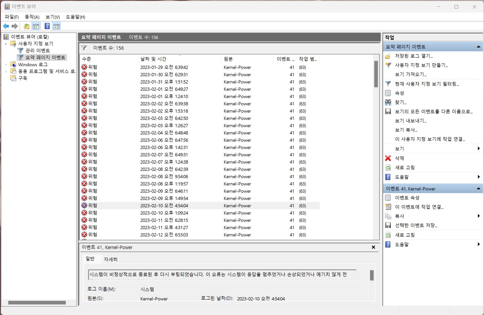 컴퓨터 종료한 시간과 컴퓨터를 킨 시간에 Kernel-Power 41(63) 이벤트가 발생했다.
