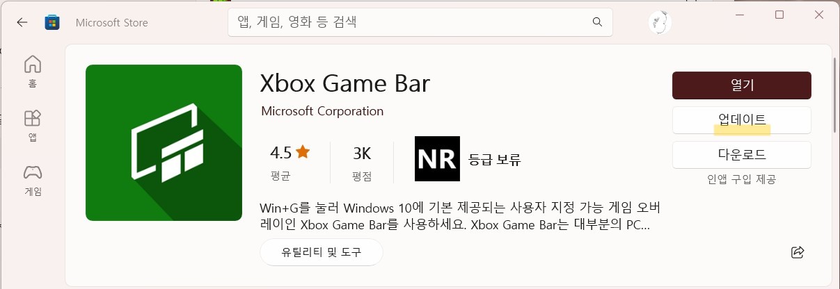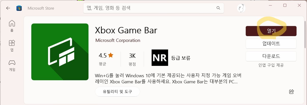 3.윈도우즈 기본앱에서 Xbox Game Bar 선택후 스토어에서 열기를 실행한다.