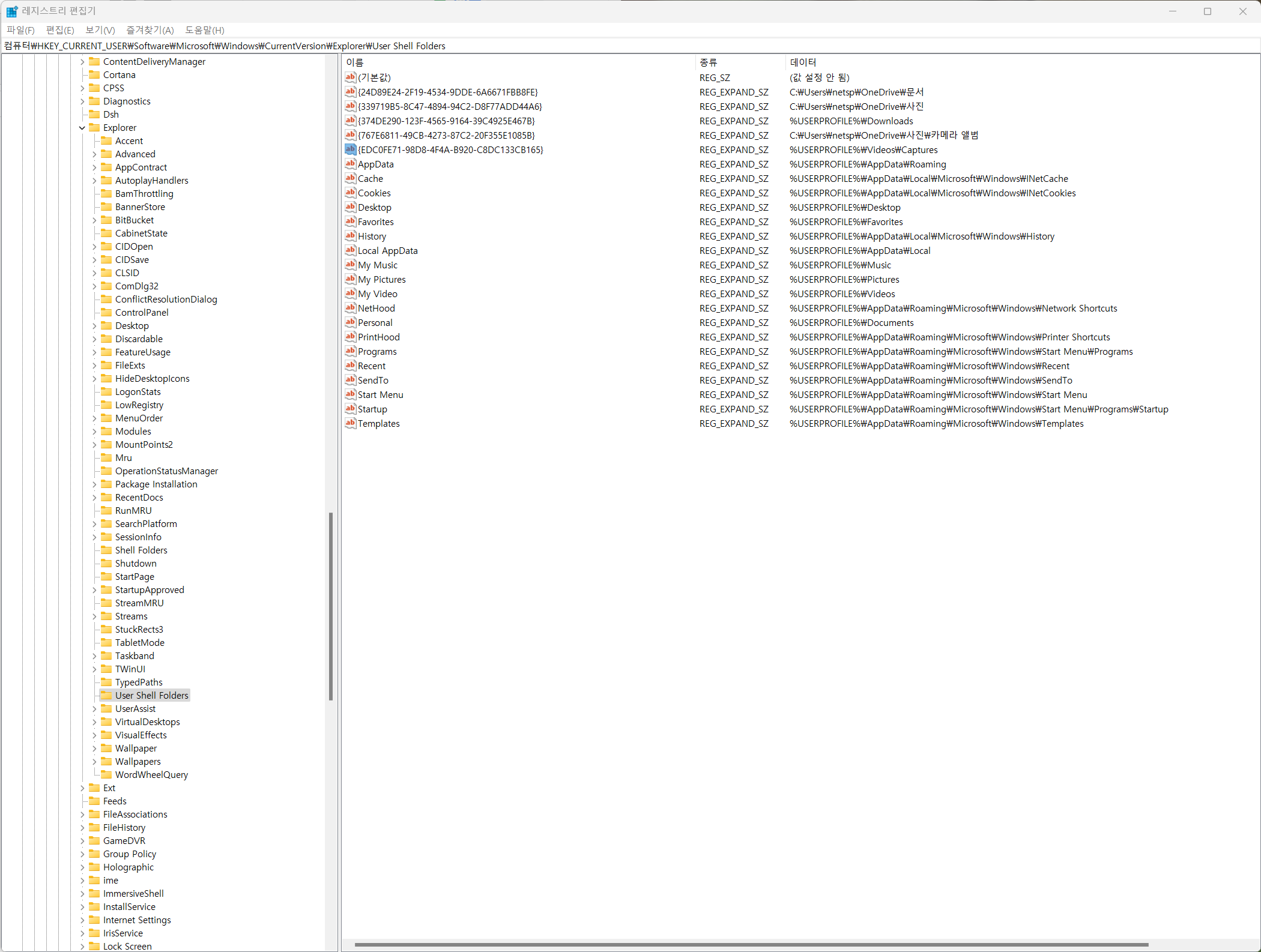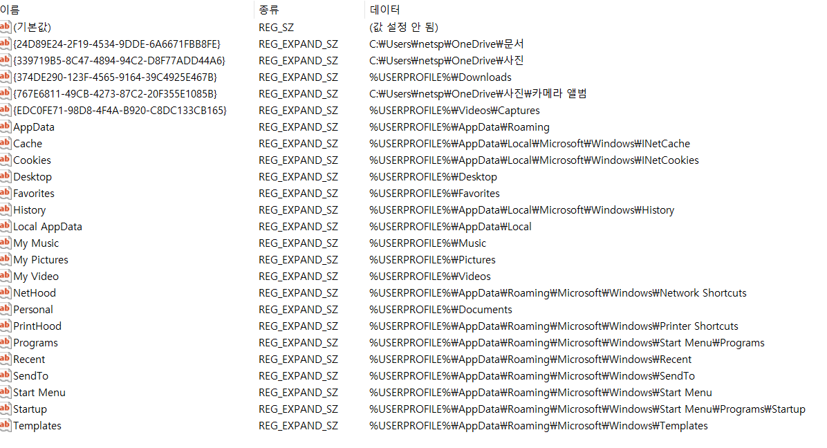 컴퓨터\HKEY_CURRENT_USER\Software\Microsoft\Windows\CurrentVersion\Explorer\User Shell Folders