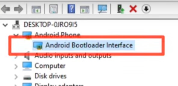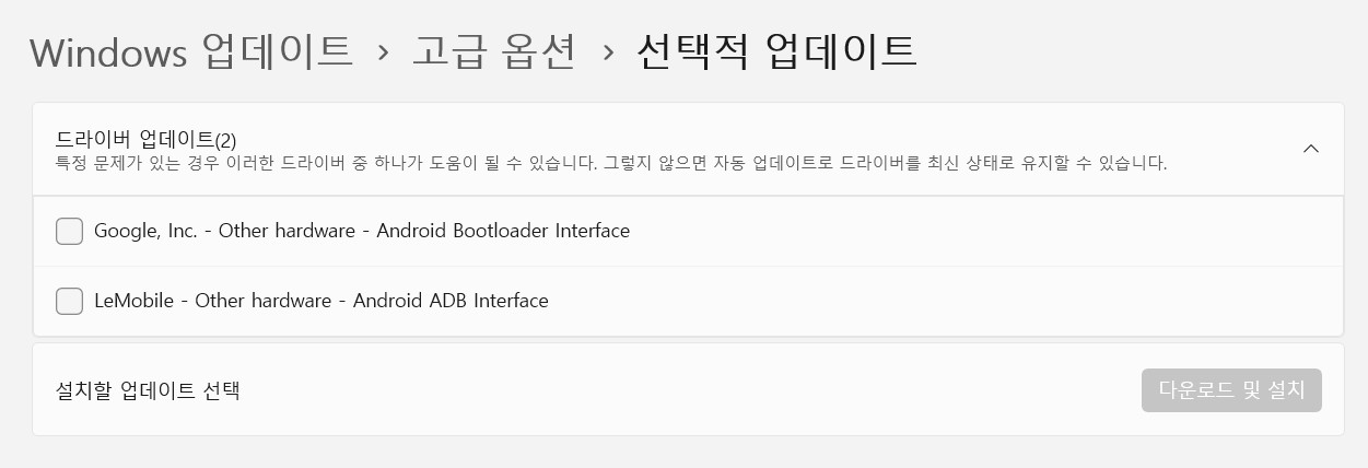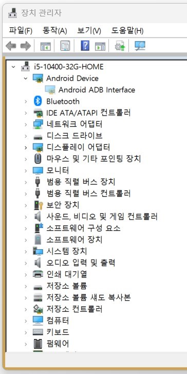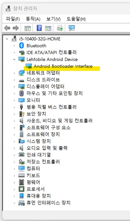Android Bootloader Interface 드라이버가 설치되어 있는 것을 확인할 수 있다.
