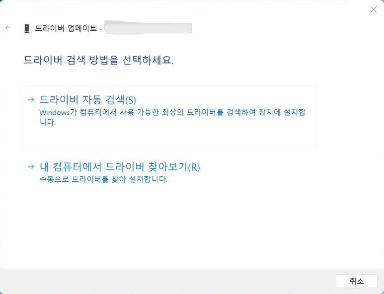 드라이버 업데이트 창이 나오면 업데이트된 드라이버 소프트웨어 자동 검색을 선택한다.