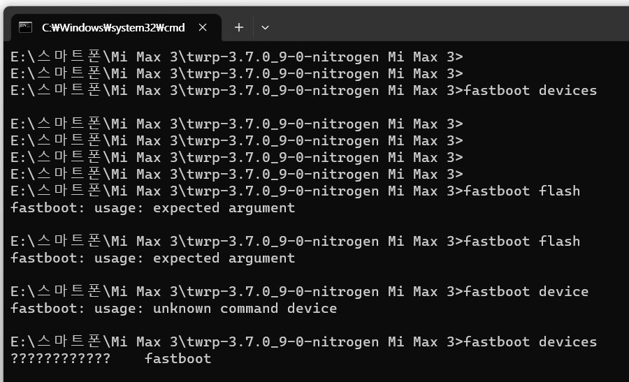 미플레시나 fastboot 명령어를 사용할때 패스트부트모드가 종료되는 현상