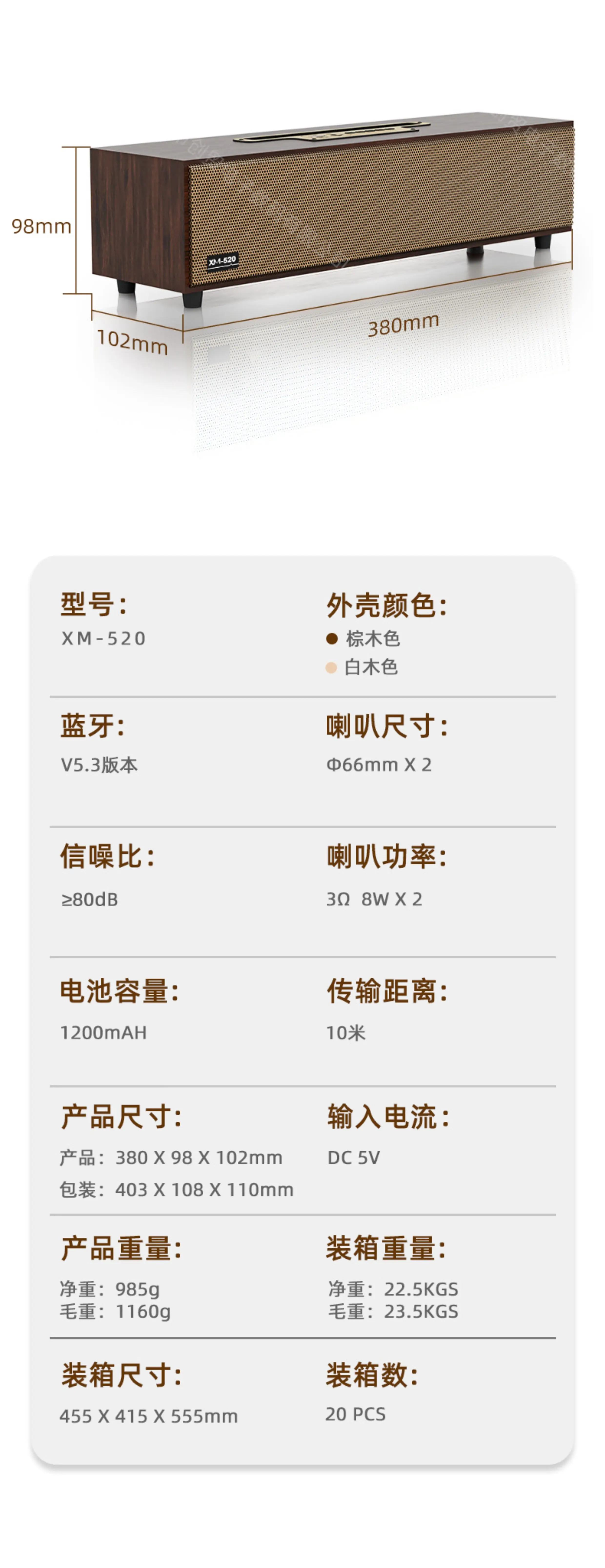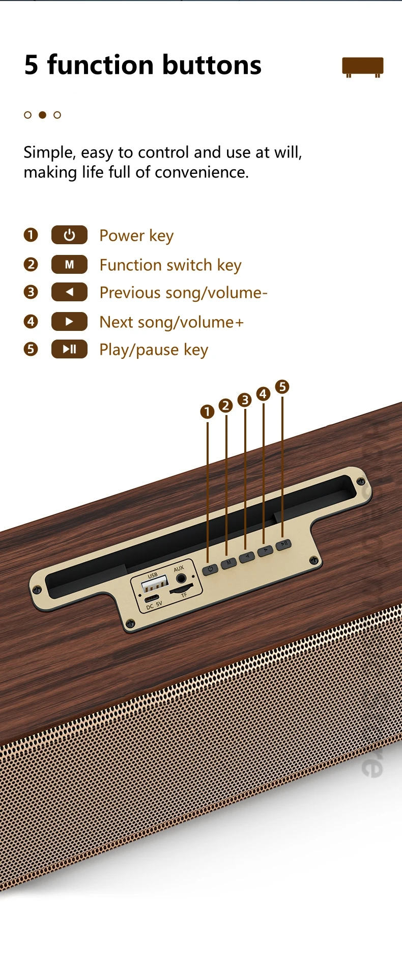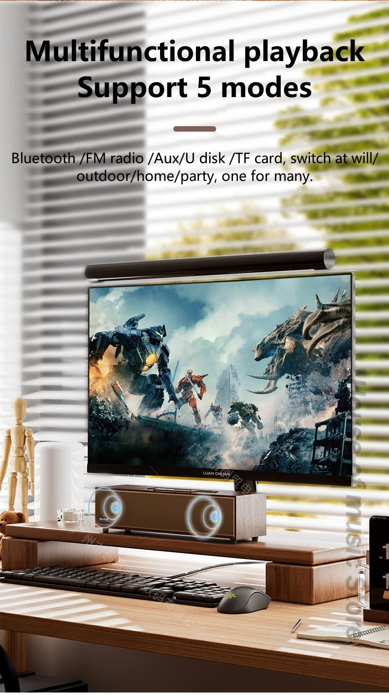 기능: 블루투스, USB 플래시 드라이브, TF 카드, Aux, FM, 통화, TWS, 휴대 전화 스탠드.