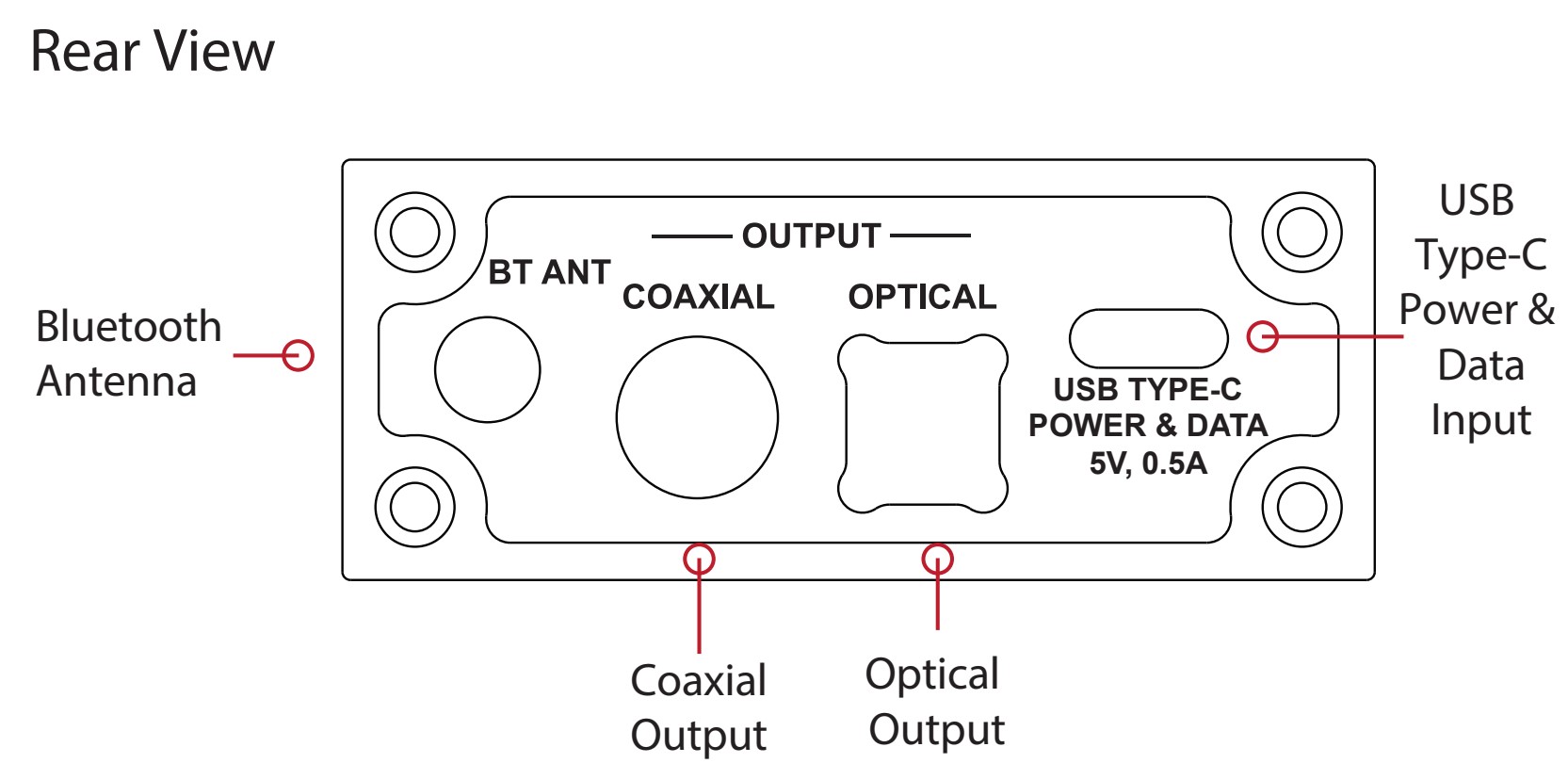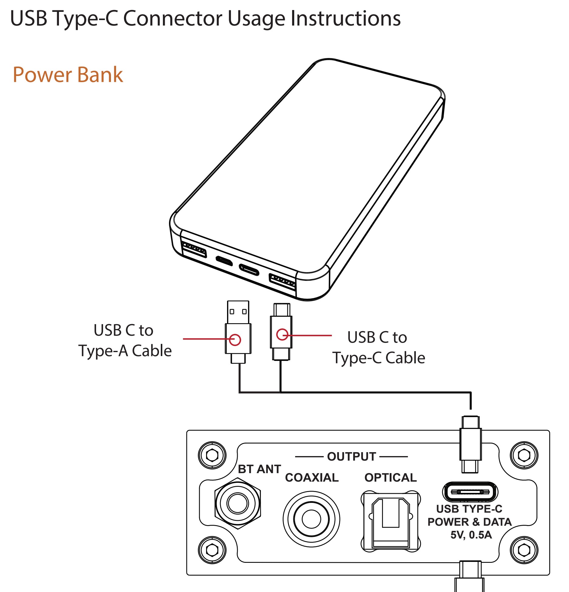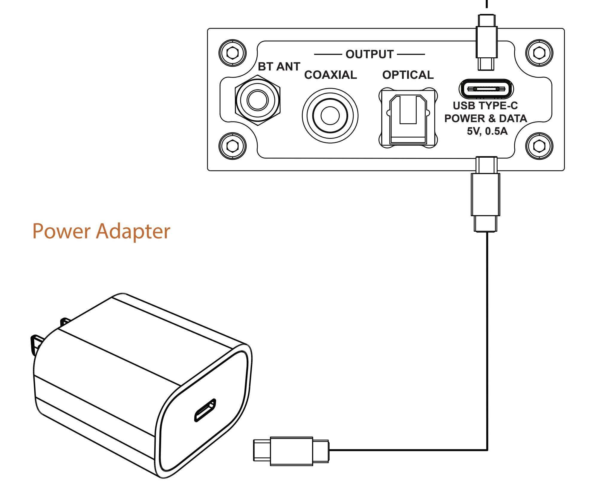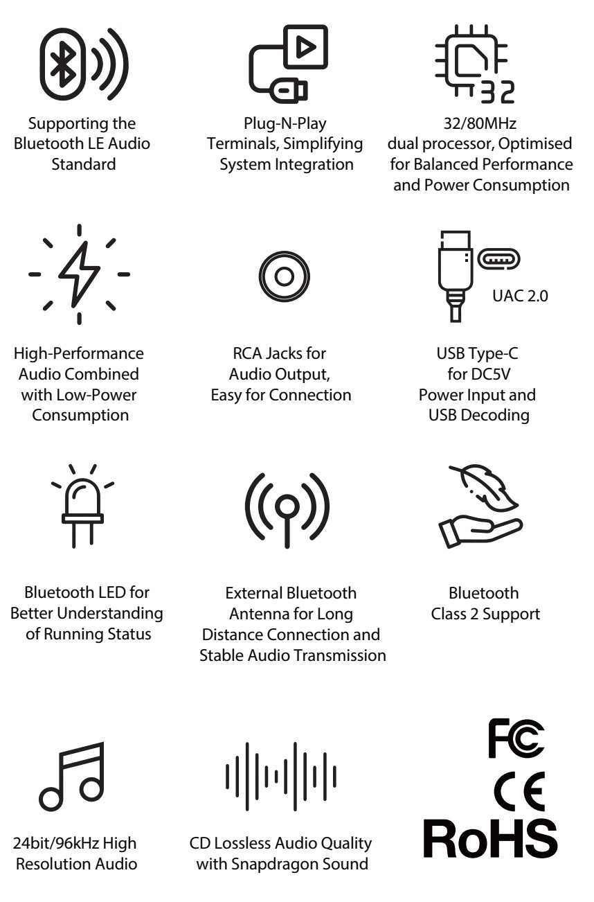 이 수신기의 Bluetooth 입력은 UAC 2.0 프로토콜과 호환되는 USB-C(DATA+POWER) 포트 로 보완되어