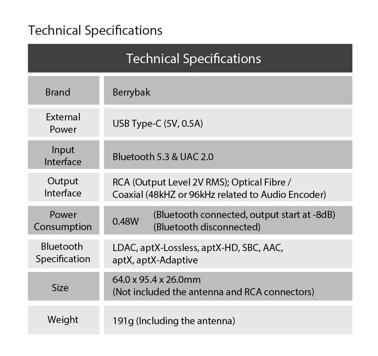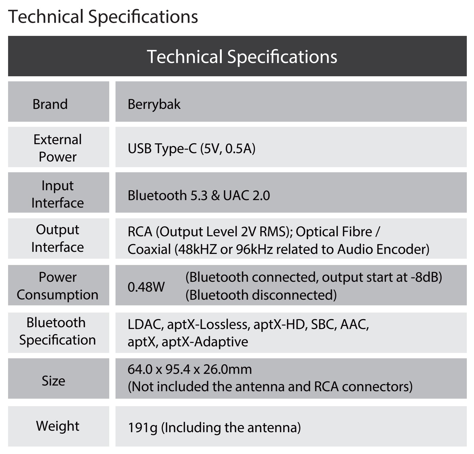 | 패키지 | BerryBak BEA1 Bluetooth 수신기 1개 Bluetooth 안테나 2개(짧은 것 하나 + 긴 것 하나) Toslink 광 케이블 1개 |