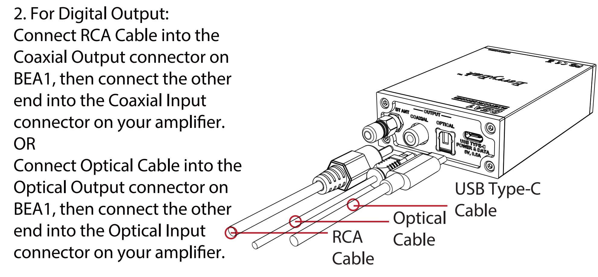 BEA1 은 디지털 신호 출력 옵션 (동축 및 광학) 을 통해 아날로그 시스템에 비해 많은 이점을 제공합니다.