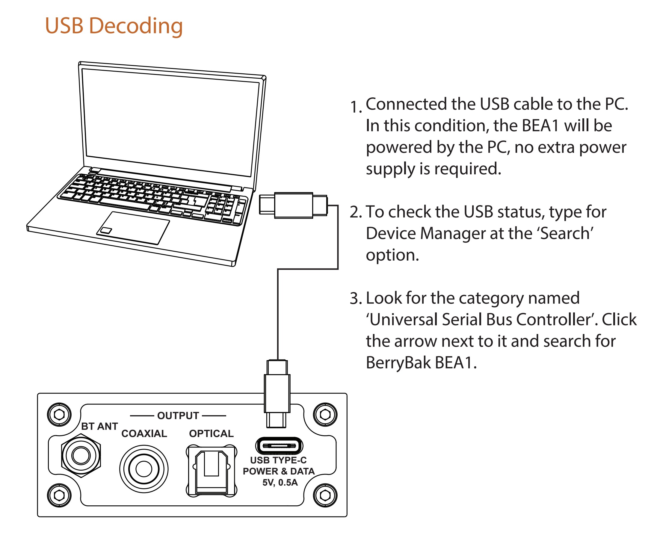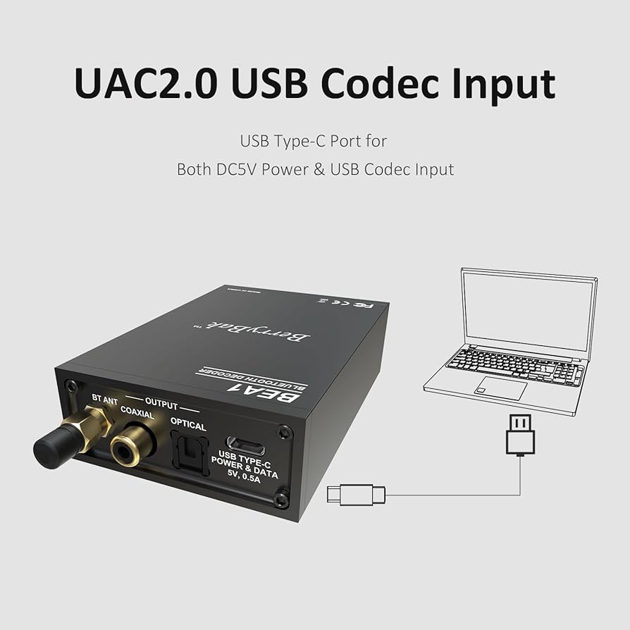 BEA1에는 Bluetooth 입력 외에도 UAC 2.0 프로토콜의 DATA 호환 USB-C 전원 포트가 있습니다.