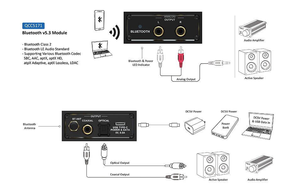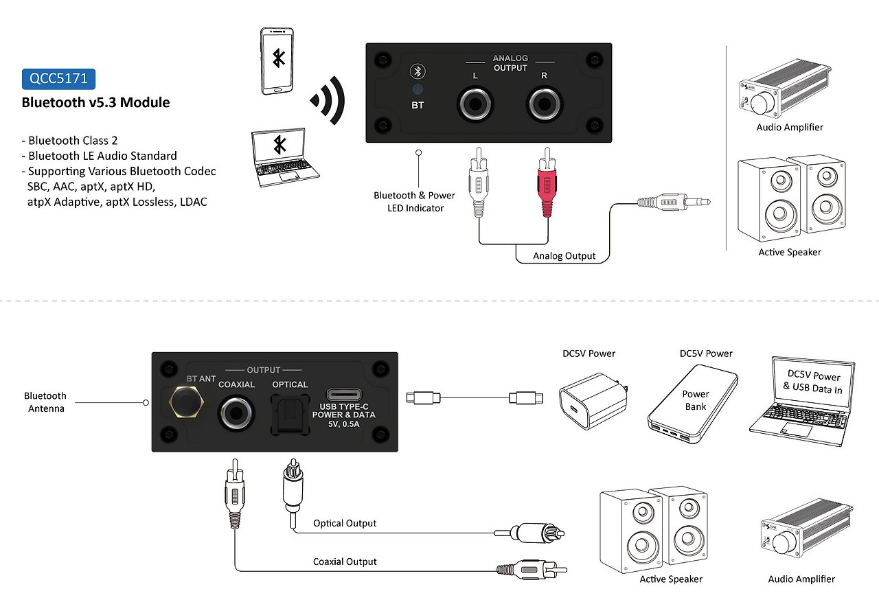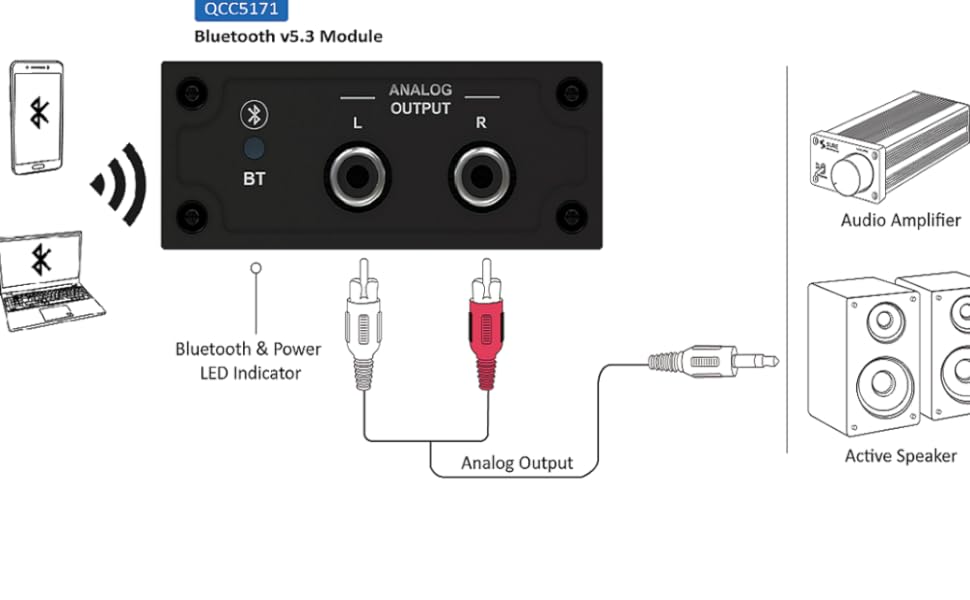이 Bluetooth 수신기에는 Qualcomm QCC5171 Bluetooth 5.3 수신기 칩 이 장착되어