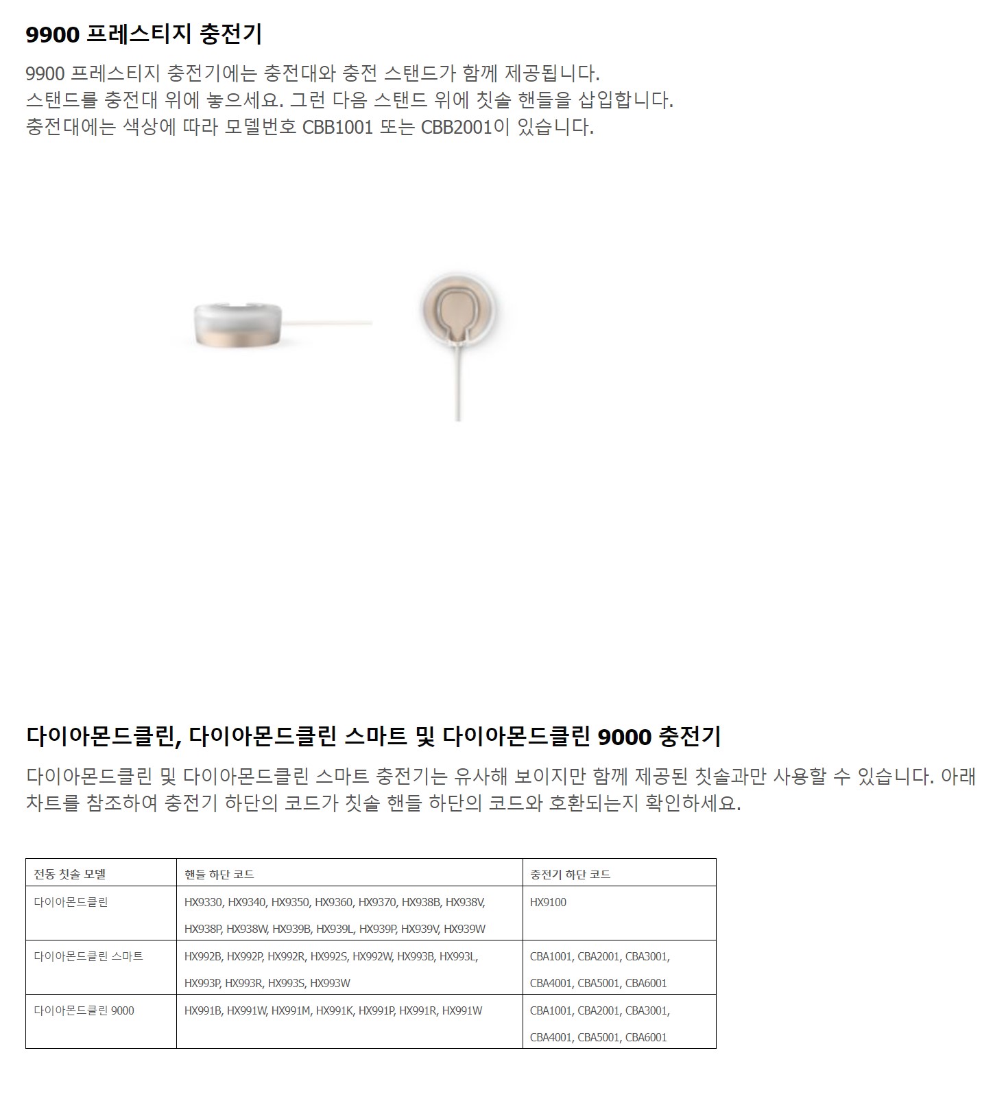 핸들 하단에 구멍이 있는 모든 소닉케어 칫솔은 베이스에 고정 핀이 있는 충전기를 사용할 수 있다.