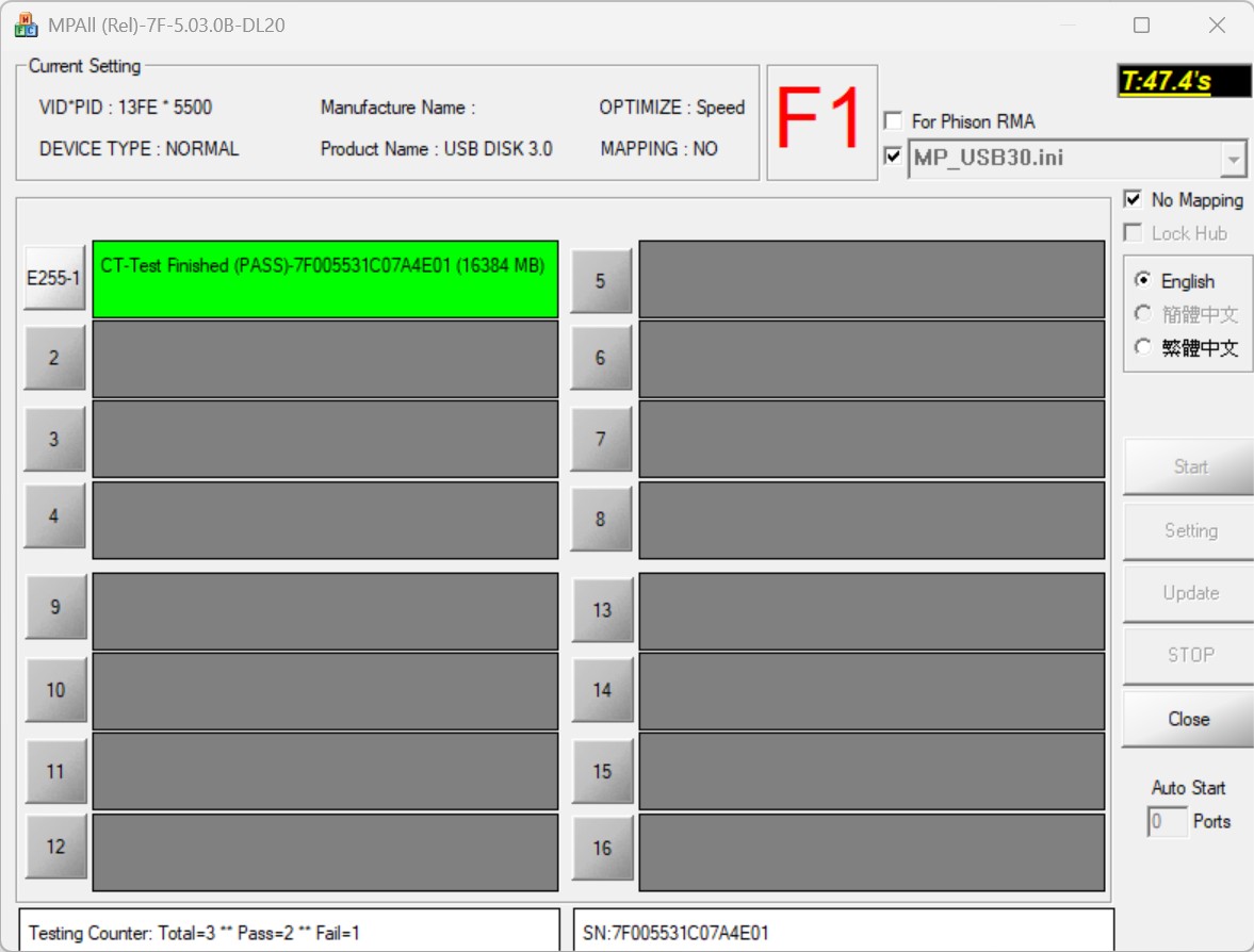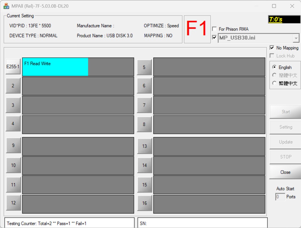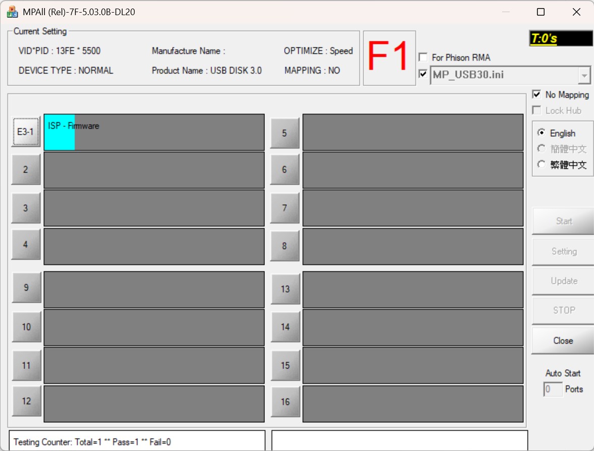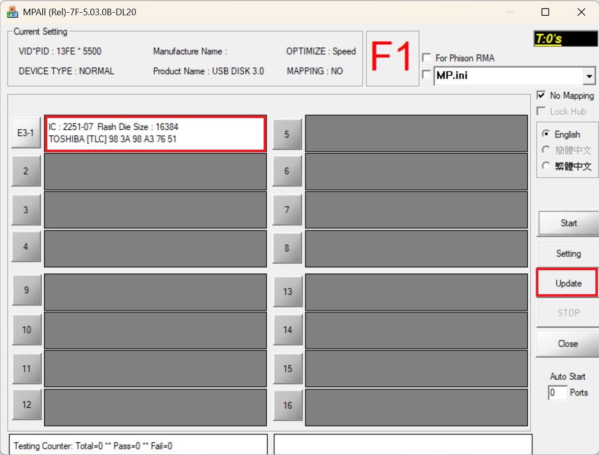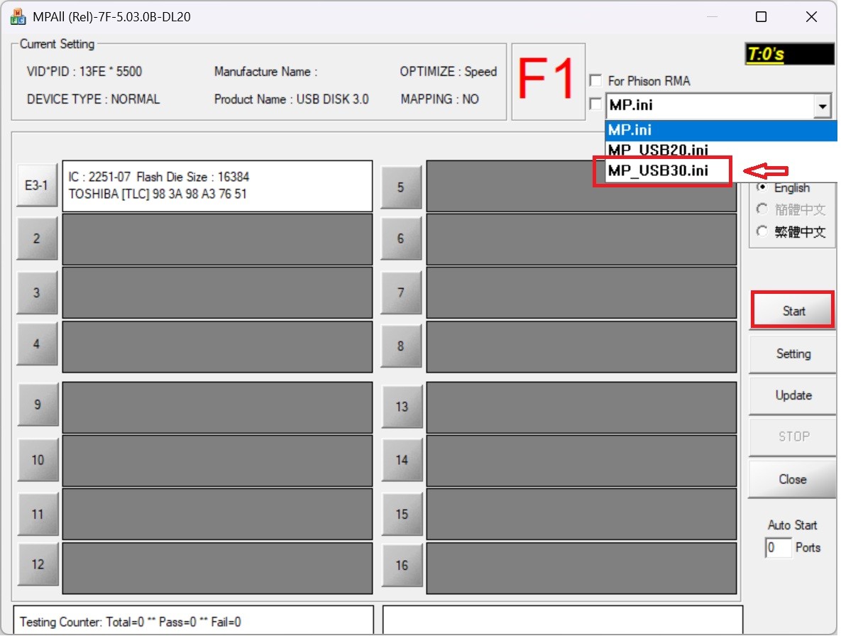 3. MP_USB 30.ini를 선택하고 Start를 눌러준다.