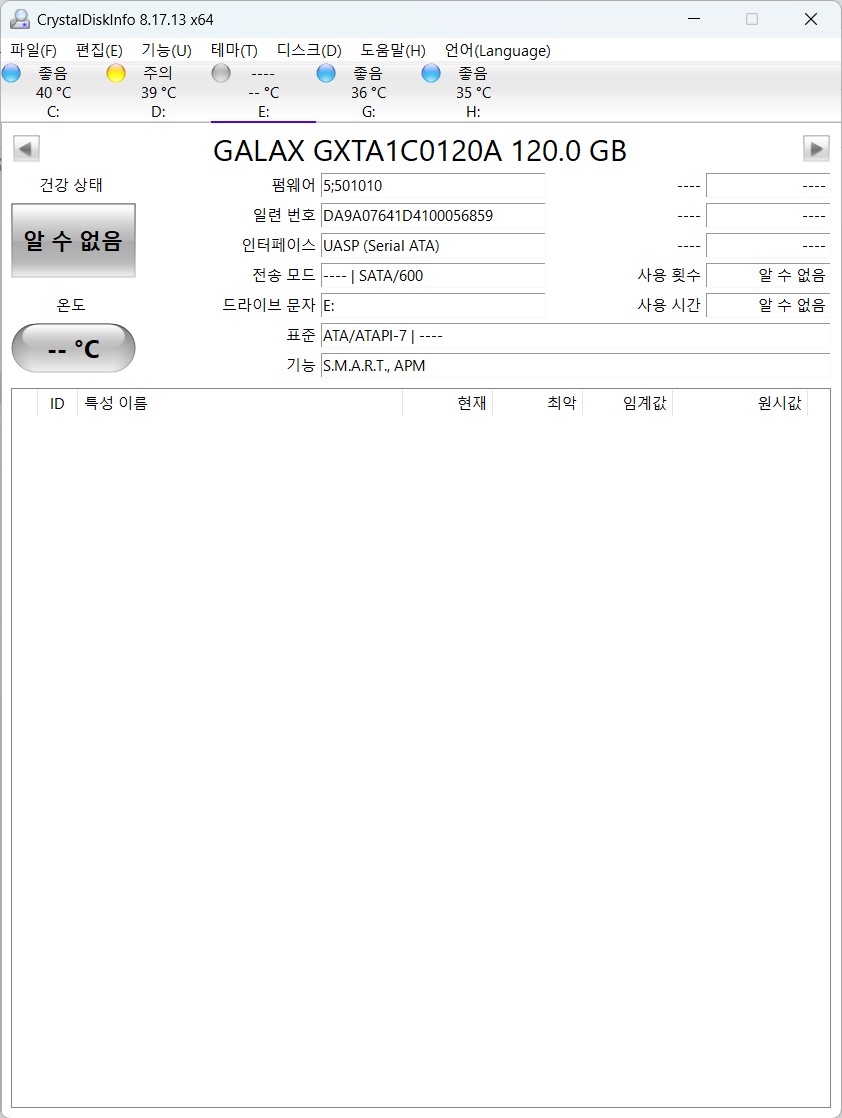 장치 관리자에서 정상적으로 디스크가 인식되지만 크리스탈디스크 인포에서 두번째 디스크 정보를 제대로 불러오지 못한다.