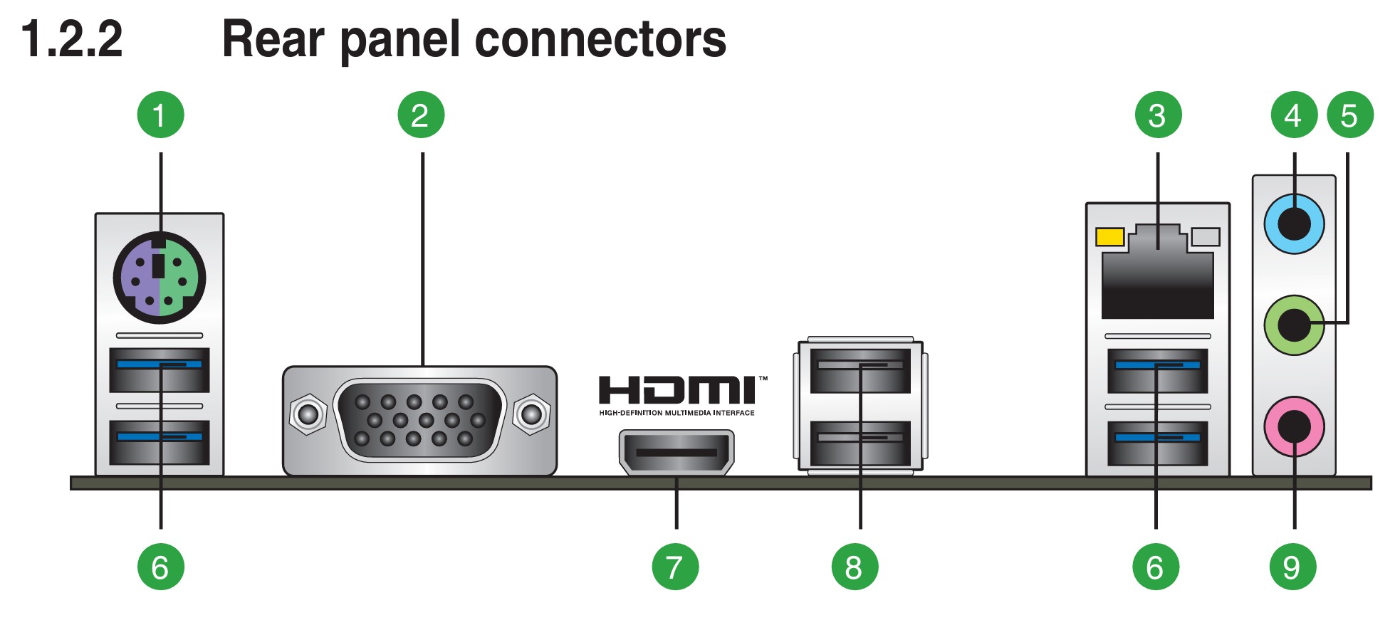 1. PS/2 키보드/마우스 콤보 포트. 이 포트는 PS/2 키보드 또는 마우스를 위한 것입니다.