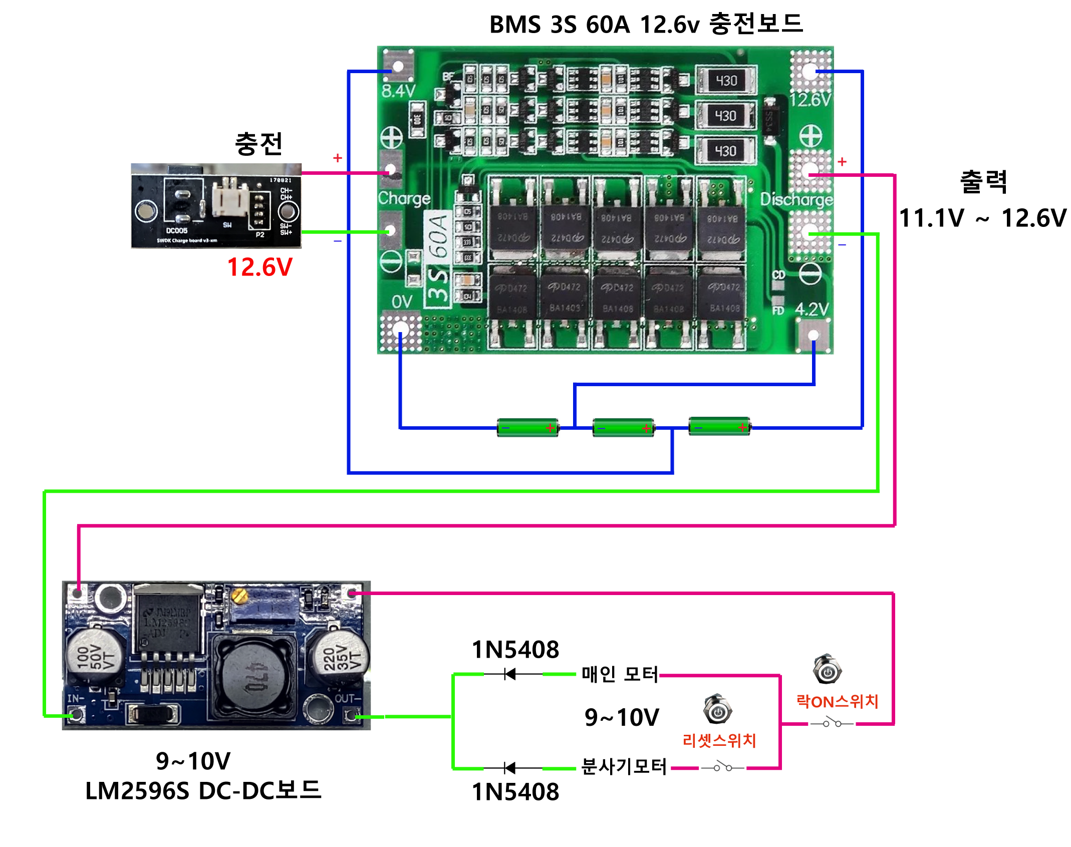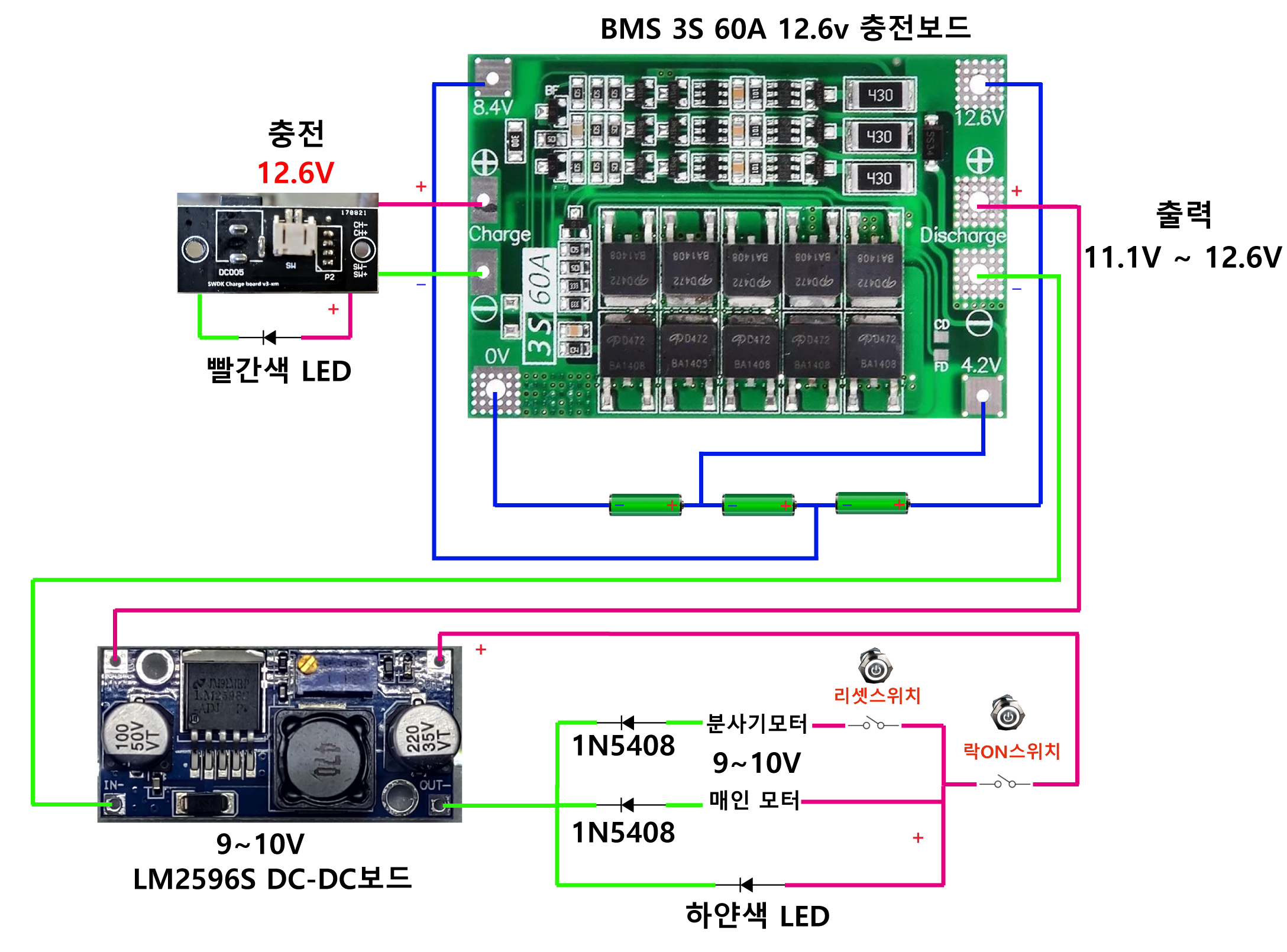 =>>>>> 전원 버튼 누르면 11.1V(?) 전압이 모터에 공급되어 작동한다.