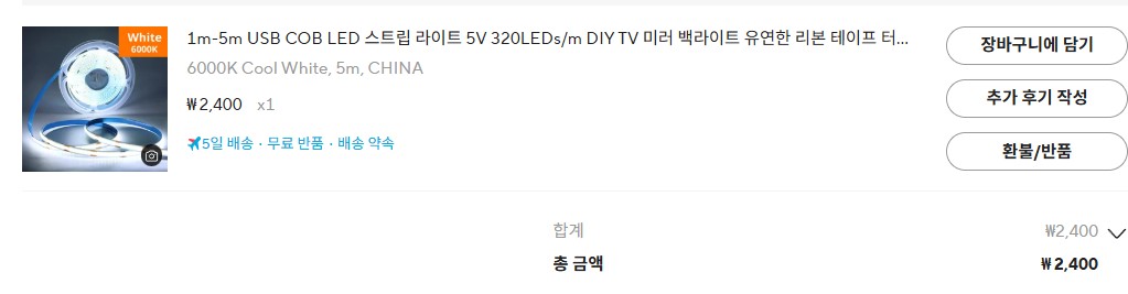 USB COB LED 스트립 라이트 5V 320LEDs/m