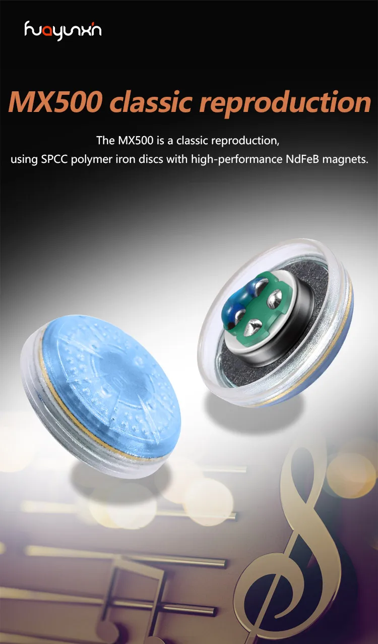Ear plug type unit 130 Ohm, size 15.4mm, unit adopts beryllium film vibration film, Japanese CCAW voice coil wire, HIFI level sound quality, the use of headphone power amplifier is more perfect, this unit human voice prominent delicate, sweet medium frequency, real super good speaker, mobile phone universal type.The overall sound is balanced, the resolution is excellent, the sound quality is very clean and bright, and the bass dives are quite good.Sound field is also good, high treble extension and not harsh, distribution of MX500 earshell 1 pair
