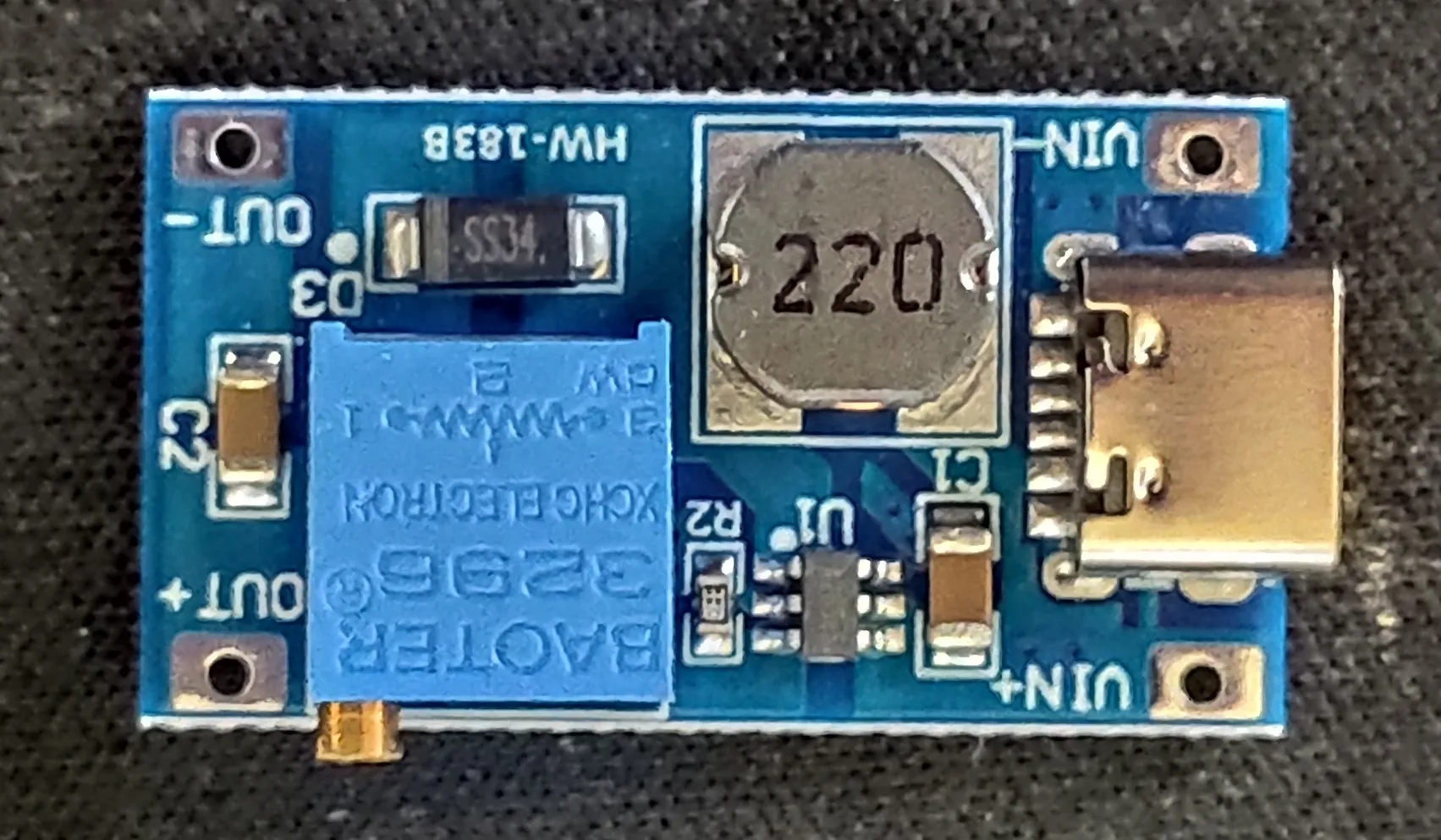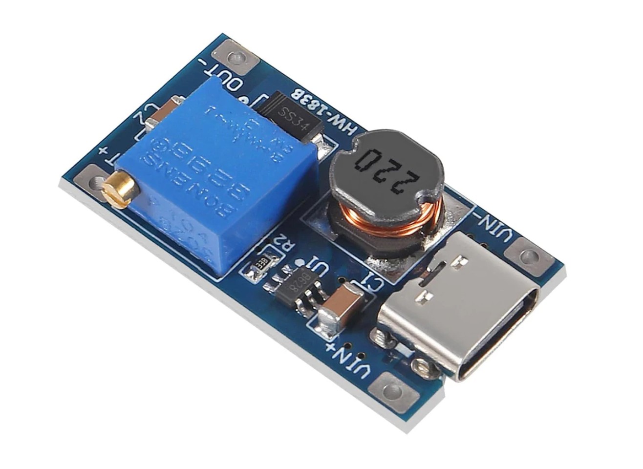 • 사용 방법: 모듈의 IN+ 및 - 단자는 2~24V이며, IN 단자의 가변 저항을 조절하여 출력 전압을 조정할 수 있다.