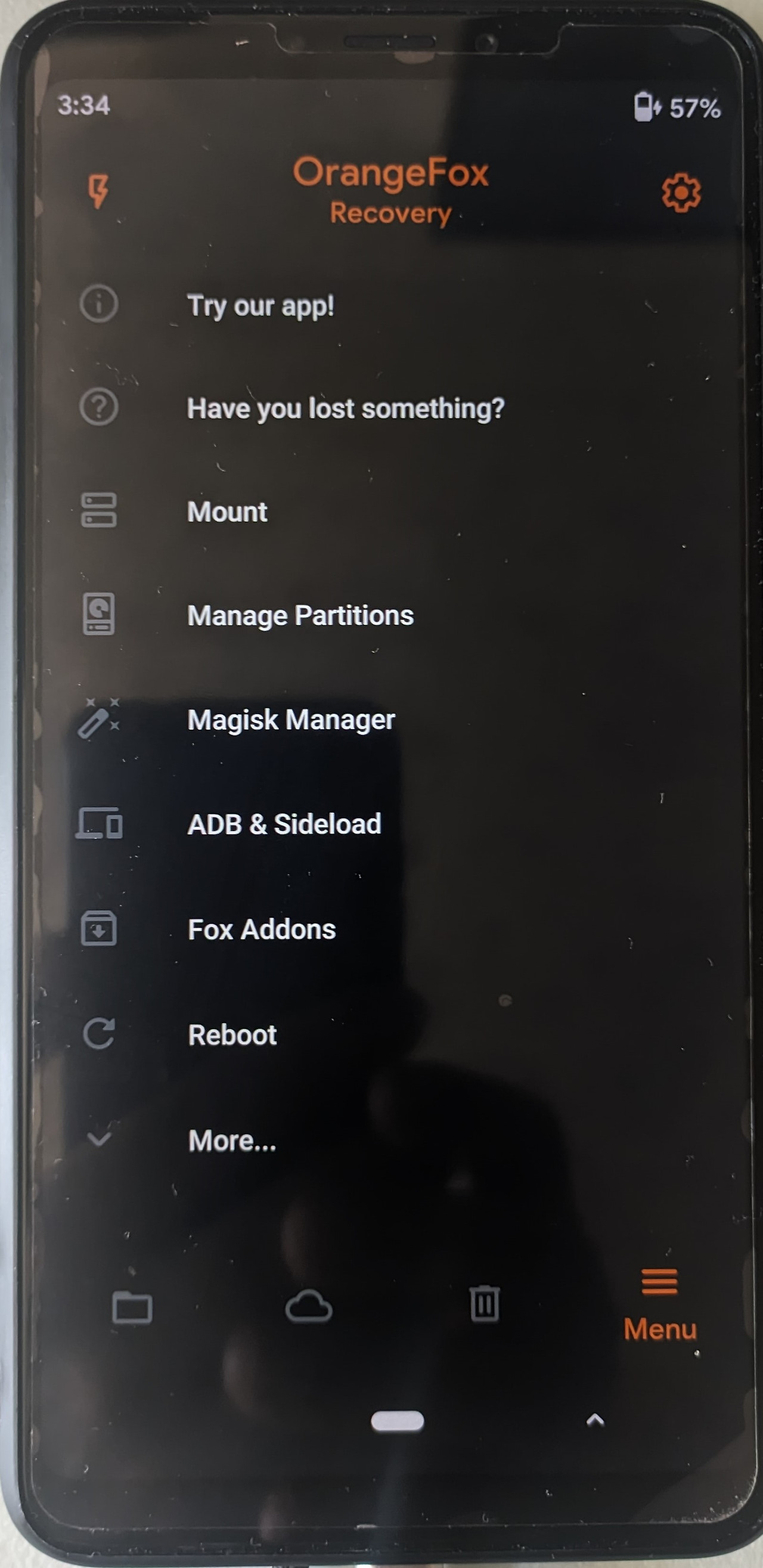 OrangeFox 리커버리 모드로 진입한다.