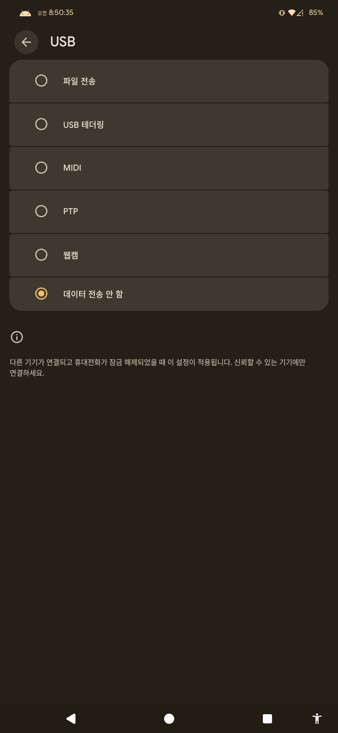 - 제조사 커스터마이징: 삼성, 샤오미, LG 등 제조사마다 USB 연결 정책을 다르게 적용하지만,