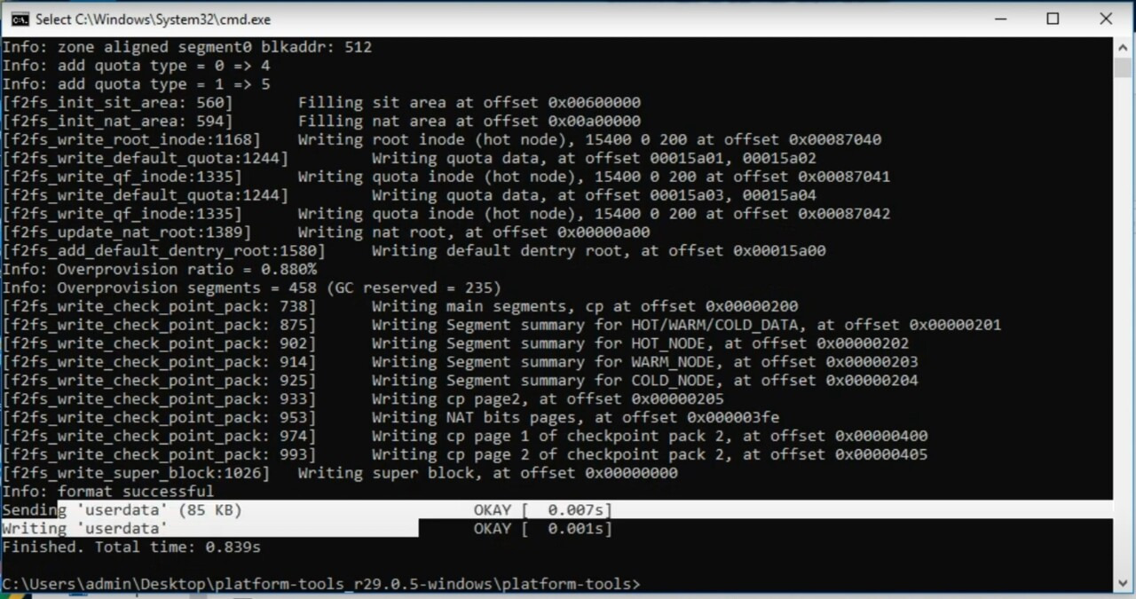 =>3. Fastboot format userdata라고 입력한다.