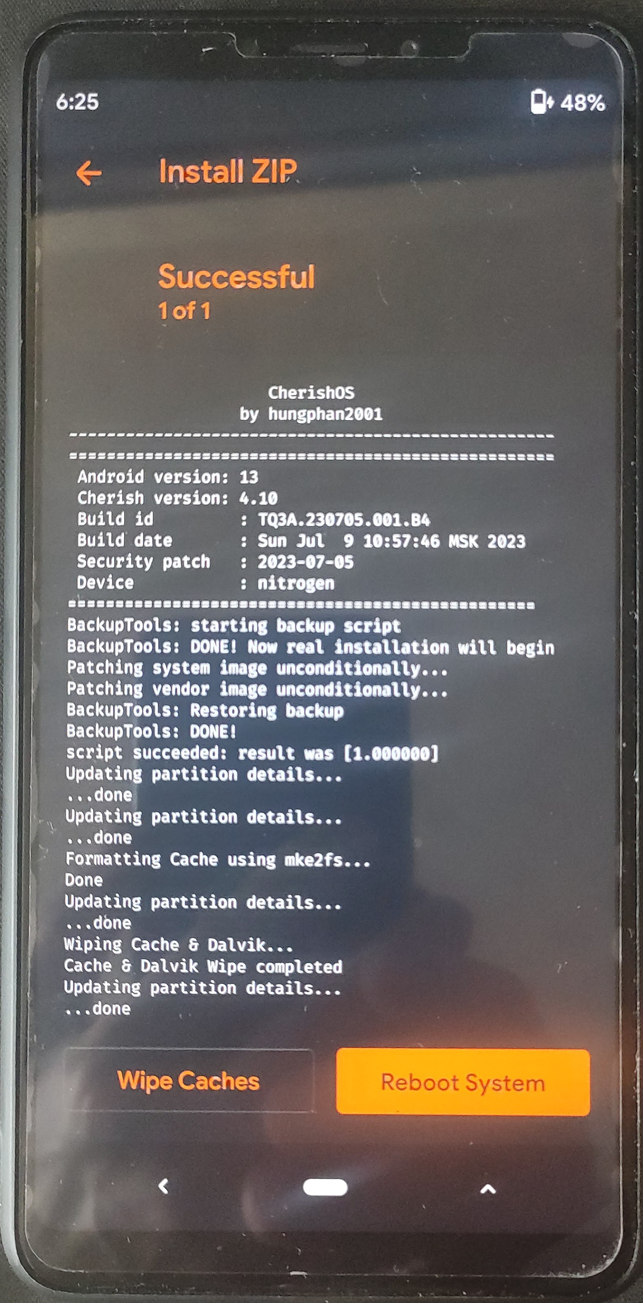 =< 설치 완료 후 Wipe Caches를 실행시켜 주고 재부팅한다.