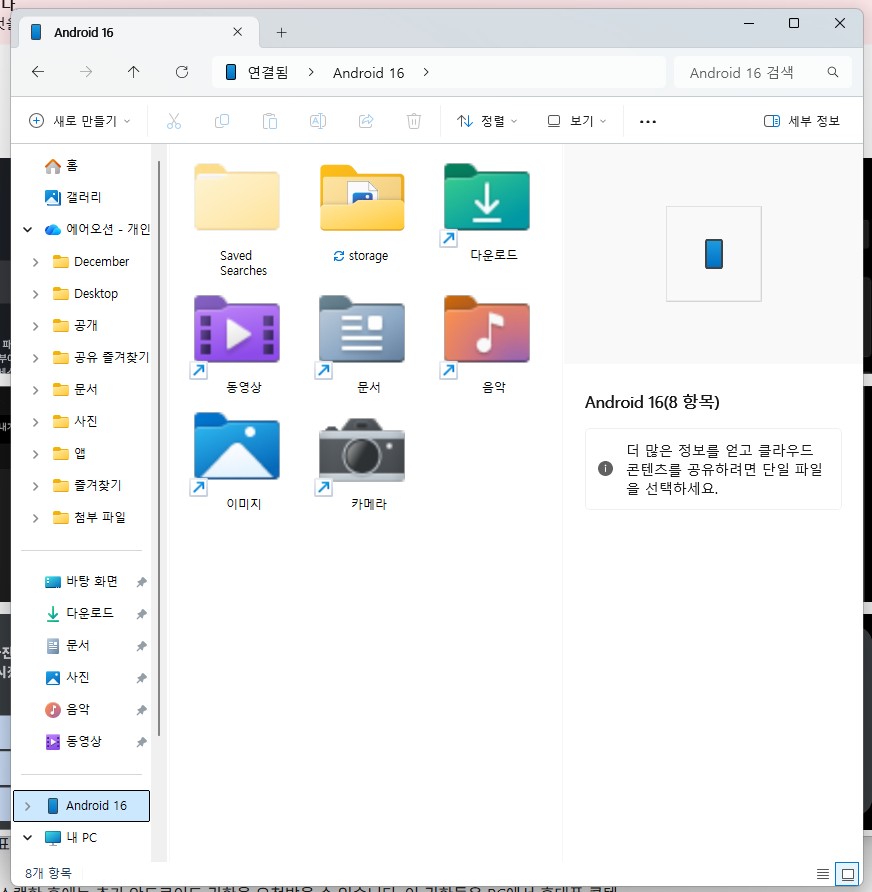👉 결론: 안드로이드 16에서는 정책상 SD카드가 PC에 직접 표시되지 않기 때문에, 보이지 않는 것이 정상이다.