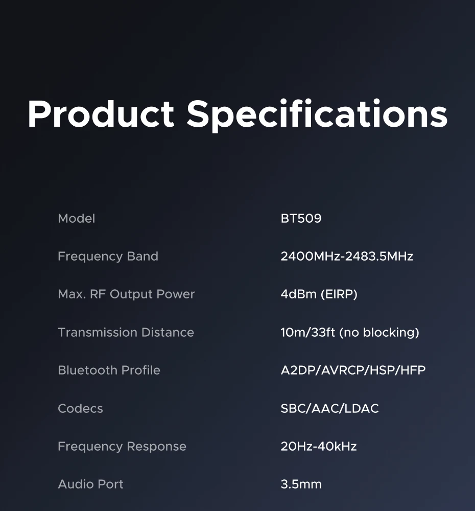 - 이 장치는 BLUETOOTH 수신기이다. UGREEN BT509는 블루투스 수신기이다. 즉, 블루투스를 지원하는 기기에서 무선으로 오디오를 수신하여 유선 오디오 시스템으로 출력하는 제품이다. 유선 기기에서 블루투스 헤드폰으로 오디오를 전송하는 기능은 없다.