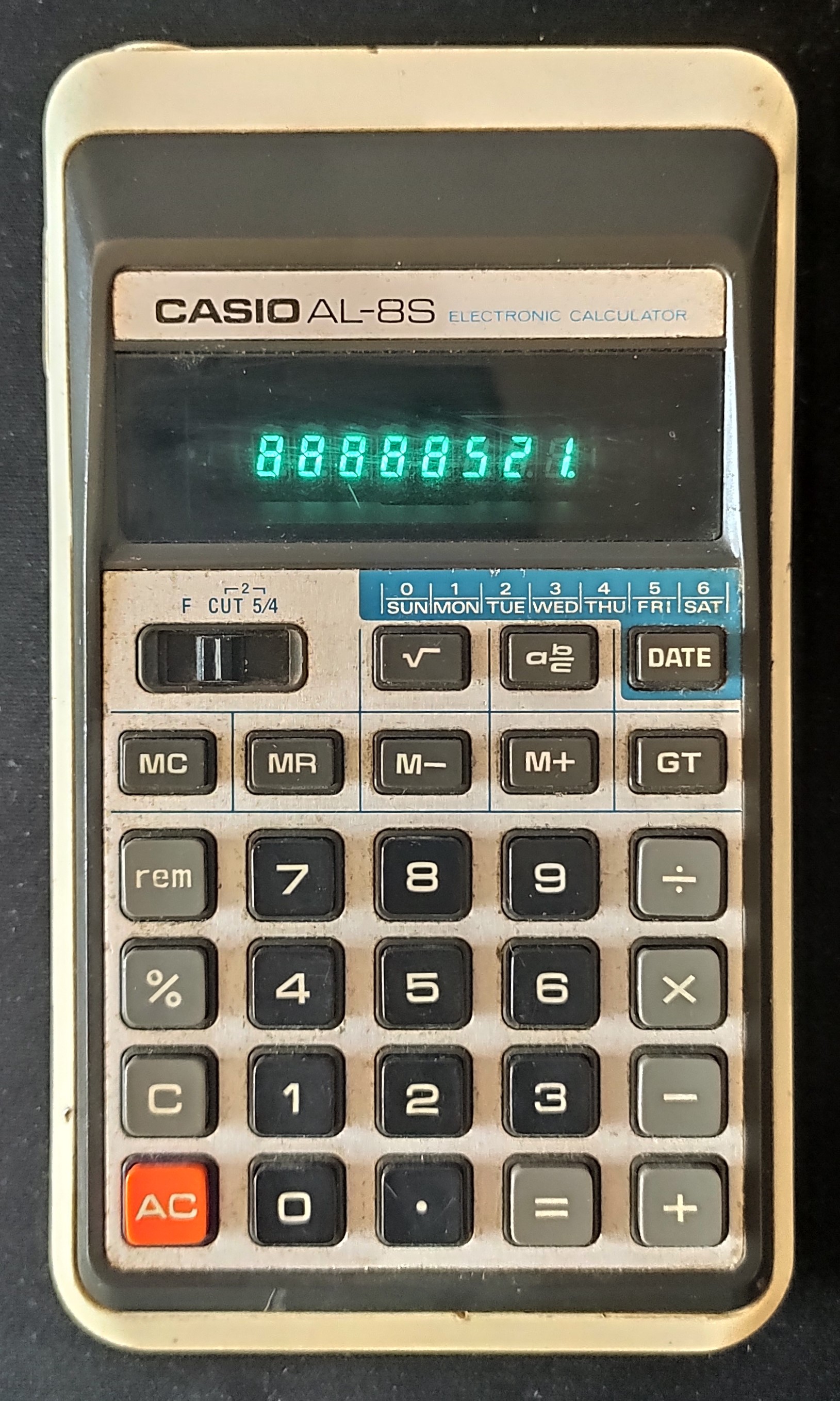 Display is 8 digits, green fluorescent.
